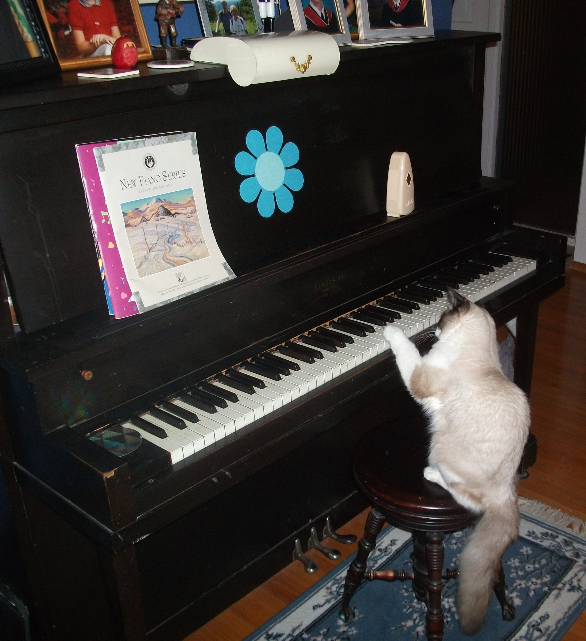 I took piano lessons when I was young but didn’t keep it up and now can only play simple tunes. My children studied the piano when they were young and music rang through our Montreal home. In 1996, we moved to Calgary and brought the piano with us. For the next 29 years, it mainly served as living room furniture–the top was handy for displaying family photographs–although, my son’s cat spent a few Christmas holidays at our home and enjoyed tickling the ivory keys.